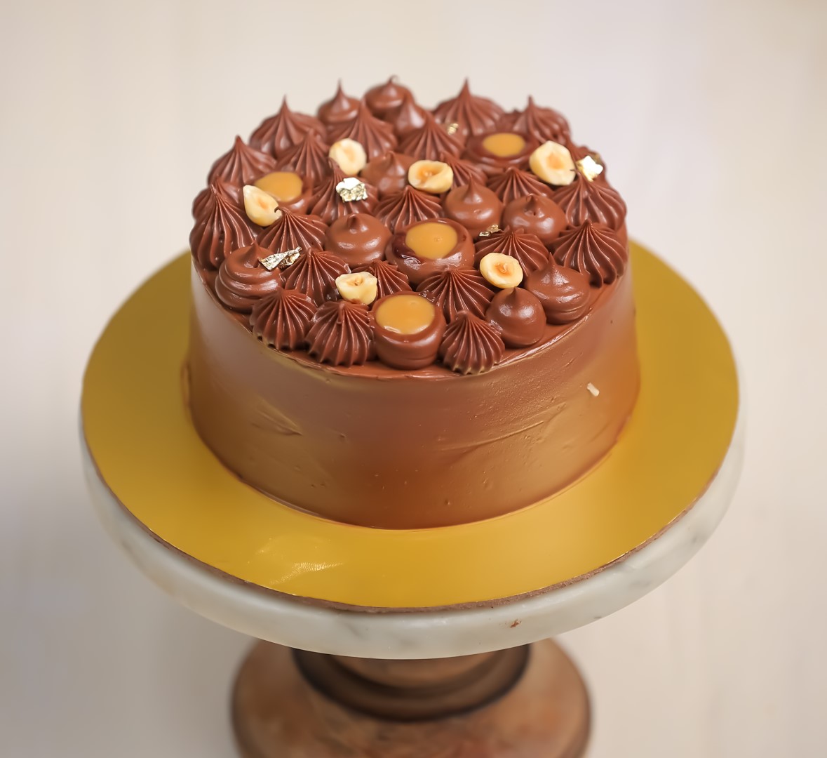 A luscious vanilla sponge infused with espresso, elegantly layered with velvety chocolate mousse and a delicate crunch of toasted hazelnuts. An exquisite symphony of flavors and textures in every bite.